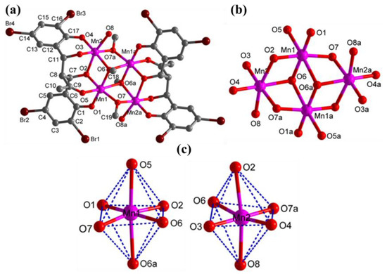 In the crystal structures of MnIII complexes 1, 2, and 3, the asymmetric unit contains two kinds of different MnIII ions, the metal center Mn1 is hexa-coordinated by three O (O7, O6, O6a (a = 1 − x, 1 − y, 1 − z)) atoms from one μ2-OMe and two μ3-OMe units, respectively, and the remaining three O atoms (O1, O2, and O5) are from a multidentate polyhydroxyl (Lna)4− ligands. The coordination geometry of Mn1 can be described as a slightly distorted octahedron geometry based on the corresponding bond lengths and angles (Figure 2c). The equatorial donor atoms O1, O2, O6, and O7 are nearly co-planar, with slight deviation from the mean plane: 0.050(2), −0.053(1), 0.051(2), and −0.048(3) Å in 1 (0.051(3), −0.054(2), 0.052(2), and −0.050(1) Å in 2, 0.050(2), −0.053(4), 0.050(2), and −0.048(3) Å in 3), respectively, and the Mn1 atom deviates by only 0.091(2) Å in 1 (0.095(3) Å in 2, 0.093(1) Å in 3) from this plane. As expected for the MnIII ion, the axial Mn1–O5 and Mn1–O6a (a = 1 − x, 1 − y, 1 − z) distances of 2.194(6) Å and 2.265(5) Å in 1 (2.210(7) Å and 2.272(6) Å in 2, 2.208(5) Å and 2.256(4) Å in 3), respectively, are longer than the four Mn-O distances in equatorial sites with Mn1–O1 = 1.899(6) Å, Mn1–O2 = 1.866(6) Å, Mn1–O6 = 2.005(5) Å, Mn1–O7 = 1.922(6) Å in 1 (Mn1–O1 = 1.882(7) Å, Mn1–O2 = 1.863(6) Å, Mn1–O6 = 1.996(6) Å, Mn1–O7 = 1.904(6) Å in 2 and Mn1–O1 = 1.885(5) Å, Mn1–O2 = 1.863(4) Å, Mn1–O6 = 2.008(4) Å, Mn1–O7 = 1.918(4) Å in 3). Obvious bond elongation, due to Jahn–Teller effect, is observed for the apical bonds O5–Mn1–O6a, which is expected for high-spin MnIII as well as on the basis of charge considerations. This phenomenon is often found in the MnIII complexes [80]. The Mn2 atoms are also hexa-coordinated by one O atom (O8) of solvent methanol (in 1) or water molecule (in 2 and 3), two O atoms (O7, O6) from μ2-OMe and μ3-OMe units, respectively, and the remaining three O atoms (O2, O3, O4) come from the (Lna)4− ligands, which generate an elongated octahedron around Mn2 on the basis of the corresponding bond lengths and angles (Figure 2c). The square bases of the octahedron for Mn2 consist of O3, O4, O6, O7a (a = 1 − x, 1 − y, 1 − z), with the apical position occupied by O2 and O8. Similarly, the apical bonds along O2-Mn2-O8 direction are elongated. The Mn∙∙∙Mn separations are 3.253(2) Å for Mn1∙∙∙Mn1a (a = 1 − x, 1 − y, 1 − z), 3.133(2) Å for Mn1∙∙∙Mn2a, 3.149(2) Å for Mn1∙∙∙Mn2a (a = 1 − x, 1 − y, 1 − z), and 5.374(2) Å for Mn2∙∙∙Mn2a (a = 1 − x, 1 − y, 1 − z) in 1 (that of 3.282(2) Å, 3.123(3) Å, 3.138(2) Å and 5.332(2) Å 2, 3.277(1) Å, 3.133(1) Å, 3.135(1) Å and 5.343(1) Å in 3). This phenomenon is consistent with the literature report [19,81,82].