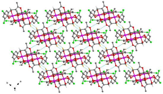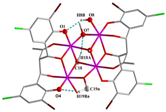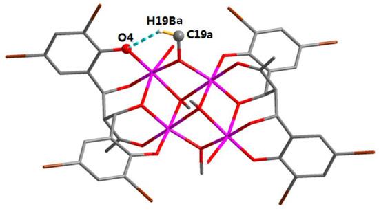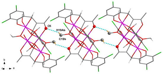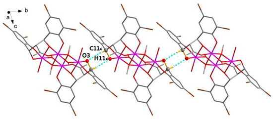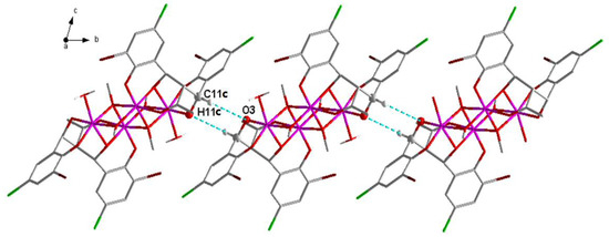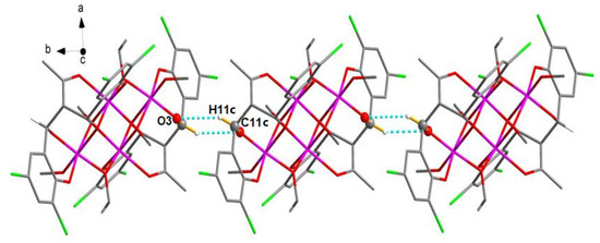 In the crystal structure of complex 3, there are a pair of intramolecular hydrogen bonds C19a–H19Ba···O4 (a = 1 − x, 1 − y, 1 − z) to stabilize the whole architecture (Figure 11, Table 3). Meanwhile, the complex 3 interlinks into one 1D infinite chain along the b axis by a weak intermolecular C11c–H11c···O3 (c = 1 − x, 2 − y, 1 − z) hydrogen bond interaction [90,91,92,93] (Figure 12).