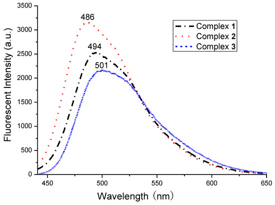 The emission spectra of the Mn(III) complexes 1, 2, and 3 were investigated in dilute DMF solution (5.0 × 10−5 mol/L) at room temperature (Figure 13). The complexes exhibit the bluish violet photoluminescence with maximum emissions at 486, 494, and 501 nm (π-π*) upon excitation at 320 nm. The changes of the maximum emission wavelength and fluorescence intensity may be related to the different substituents on complexes 1, 2, and 3 [94,95,96,97,98,99,100]. As discussed above, because of the coordination of MnIII ions to the ligand, which resulting in increasing of the delocalization of electrons and reducing the energy gaps between the π-π* molecular orbitals of the ligand in the complexes (from 3, 1 to 2).