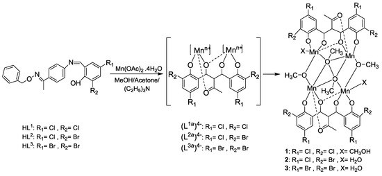 Moreover Schiff base ligands and their complexes have been application in many fields [20,21,22,23], such as biological activity reagents [24,25,26,27,28,29,30,31,32,33,34], magnetic materials [35,36,37,38,39,40,41,42,43], luminescent materials [44,45,46,47,48,49,50,51,52]. Based on this, we designed and synthesized three Schiff base ligands with different halogen substituents and their MnIII complexes 1, 2, and 3, respectively. In the synthesis of this MnIII complexes, due to the hydrolysis chemoselective cleavage of the C=N bond of the original Schiff base ligands (HL1, HL2, and HL3), forms the corresponding halogenated salicylaldehyde molecules and further the α,α double aldol addition of acetone to two halogenated salicylaldehyde molecules promoted by Mnn+ ions in situ, leading to a unique corresponding multidentate polyhydroxyl ligand (Lna)4−, acetone-disalicylaldehyde aldol (Scheme 1). On the basis of the synthesis of multinuclear MnIII complexes, we have investigated the crystal structure and spatial configuration of the multinuclear MnIII complexes with different halogen substituents. To the best of our knowledge, a few aldol additions were previously reported as a one-pot reaction or a specific Mnn+-promoted reaction.