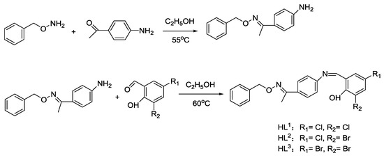 HL1, HL2, and HL3 were synthesized according to an analogous method reported previously in the literature [53,54,55,56,57,58,59,60]. The synthetic route involved in the synthesis of HL1, HL2, and HL3 are given in Scheme 2.