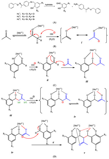 Proposed mechanism for the Mnn+-promoted α,α double aldol additions. (A) Hydrolysis of Ligands HL1, HL2, and HL3. (B) Deprotonation of the acetone. (C) Activation of the salicylaldehyde derivatives and aldol addition. (D) Deprotonation of the aldol product and second aldol addition.