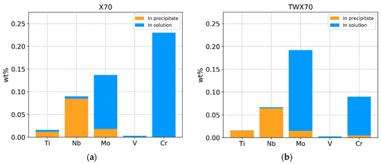 Composition in (wt %) of each element either in solid solution or in precipitate form for (a) X70 steel and (b) TWX70.
