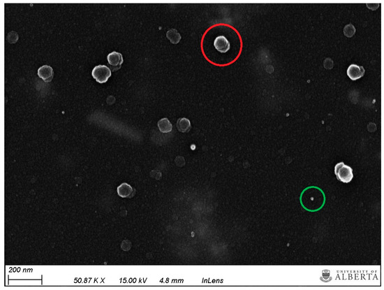 Figure 2 shows an SEM image of individual precipitates (circled in green) that were retained on the carbon tape following evaporation of the ethanol and precipitate suspension described in Section 2.6. Small agglomerates of precipitates (circled in red) are also observed. For the purpose of this work, only the size of the individual precipitates was measured.