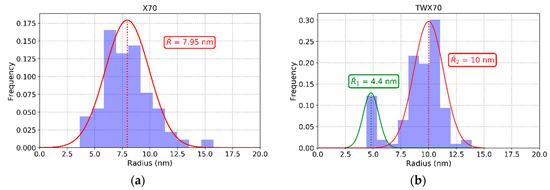 Measured size distributions of nano-sized precipitates from SEM images for (a) X70 steel (82 particles) and (b) TWX70 steel (112 particles).