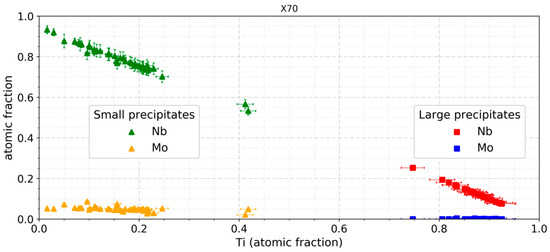 The composition of individual precipitates was determined using SEM-EDX analysis. Figure 4 shows the atomic fraction of Nb, Ti, and Mo measured for both fine and large (µm scale) particles for the X70 steel. The large precipitates are Ti-rich, while the fine (nano) precipitates are composed primarily of Nb with some Mo and Ti. For both precipitate sizes, Nb replaces Ti in the precipitate structure. The atomic fraction ranges from 0.95 to 0.75 Ti for the large precipitates, while the fine precipitates exhibit a Nb atomic fraction range from 0.55 to 0.93, with the majority >0.7 Nb. The Mo present in the fine precipitates is relatively constant at an atomic fraction of ≈0.05 and is relatively independent of the Ti atomic fraction. The Mo content of the large precipitates is virtually nil.