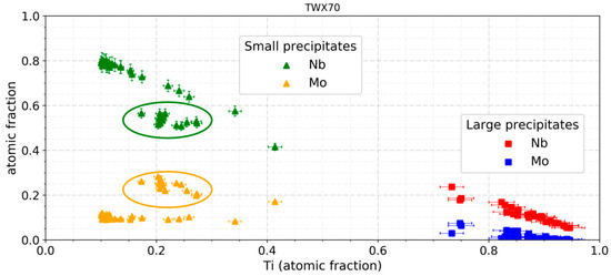 Figure 5 shows the atomic fraction of Nb, Ti, and Mo, measured for both fine and large (µm scale) precipitates for TWX70 steel. As observed for the X70 steel, the large precipitates are Ti-rich, while the fine (nano) precipitates are composed primarily of Nb, with lower levels of Mo and Ti. The atomic fraction of the large precipitates ranges from 0.95 to 0.75 Ti. The fine precipitates exhibit a Nb atomic fraction range from 0.4 to 0.83; however, unlike the X70 steel, the nano-sized precipitates exhibit two groupings of composition. In one grouping, there is range of Nb atomic fractions (0.4 to 0.8) with Ti content decreasing as Nb content increases, and the Mo content is relatively constant at an atomic fraction of ≈0.10. In the second grouping (circled in Figure 6), the Mo content is significantly higher, i.e., with an atomic fraction ranging from 0.22 to 0.28, accompanied by a lower Nb content (0.52 to 0.56 atomic fraction). The presence of the second grouping of precipitates is attributed to the higher Mo content and lower Nb content of the TWX70 steel (Table 1).