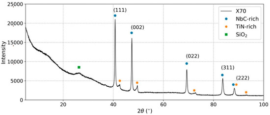 An XRD pattern of the residue collected from the X70 steel in shown in Figure 6. The relatively small and broad peak at 2θ ≈ 27° is attributed to a small amount of amorphous SiO2. Couplets of peaks (a large intensity peak followed by a significantly less intense diffraction peak) are observed throughout the diffraction pattern. The large first peak is associated with a Nb/C-rich precipitates, whereas the second (and smaller) peak in each set is associated with Ti/N-rich precipitates. Both peaks in each couplet are characteristic of a NaCl-type structure (Fm3m space group). The diffraction planes (e.g., (111)) for each couplet are included in Figure 6.