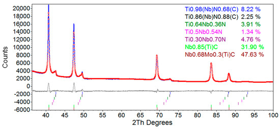A mass balance comparison, between the ICP data and the relative amount and atomic composition of each precipitate type calculated through Rietveld refinement, for Ti, Nb, and Mo was undertaken (Figure 11). The amount of each element in the precipitates from Rietveld refinement was calculated based on the size of the steel sample, the weight of the residue, the atomic composition, and the wt % determined by Rietveld refinement (Table 4 and Table 5). The ICP measurements independently confirm the veracity of Rietveld refinement in determining the element distribution in the precipitates for microalloyed steels.