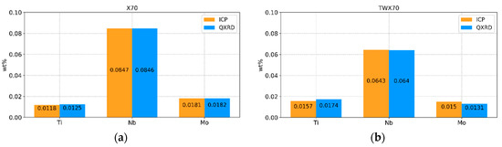 Comparison of Ti, Nb, and Mo amounts in precipitates for ICP and QXRD for (a) X70 steel and (b) TWX70 steel.