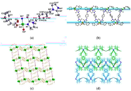 The structure of compound 1: (a) coordination environment of the Zn(II) ion (symmetry transformations used to generate equivalent atoms codes: 1 1 − X, +Y, ½ − Z; 2 1 − X, 1 − Y, −Z); (b) 1D Z-type chain structure; (c) polyhedral representation of the 2D layer; (d) 3D framework formed by π···π interactions and hydrogen bonding (green, Zn; red O; blue, N; gray, C).