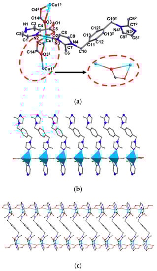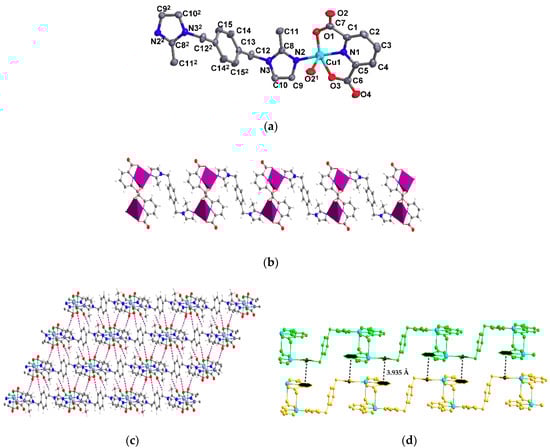 3.2. Crystal Structures of [Cu(1,4-bmimb)0.5(2,6-PyDC)]n (2)