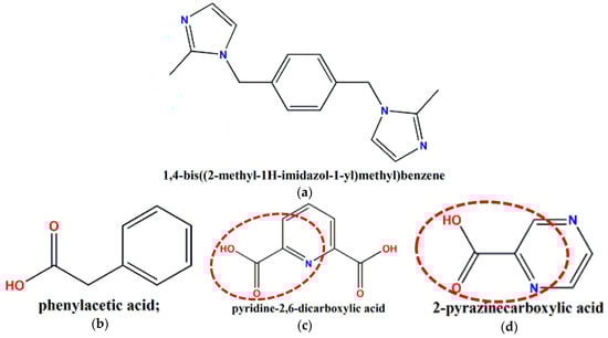 Construction of ligands for compounds 1–3: (a) the primary ligand of compounds 1–3, named 1,4-bmimb; (b) the co-ligand of 1, named PhAA; (c) the co-ligand of 2, named 2,6-PyDC; (d) the co-ligand of 3, named 2-PAC. Red dotted lines indicate corresponding functional groups.