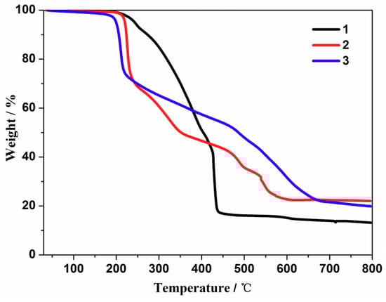 Curves of thermal gravimetric analysis (TGA) for compounds 1–3.