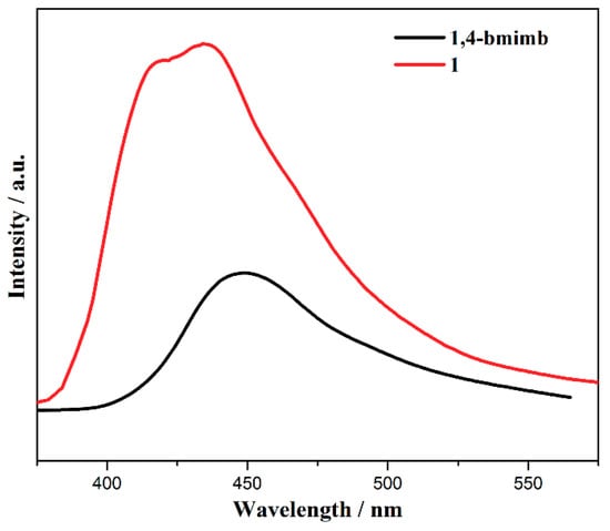 The luminescent properties of CPs with d10 metal centers have attracted intense interest because of their potential applications in chemical sensors, photochemistry, and electroluminescent displays [,,]. Therefore, synthesizing a novel Zn(II)-CP is a method for obtaining novel luminescent materials. The fluorescence properties of 1 and 1,4-bmimb ligand are shown in Figure 6 (λex = 350 nm). When excited at 350 nm, compound 1 and the 1,4-bmimb ligand showed strong fluorescence emission peaks at 442 nm and 453 nm, respectively. The difference in peak position may be owing to the interaction of metal and ligand, or the interaction between molecules, such as π···π stacking.