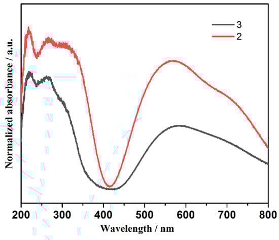 The UV-vis absorption spectra of 2 and 3 were given under the conditions of solid state and room temperature (Figure 7). In the UV region of the spectrum (200–350 nm), it is intraligand transitions that result in the absorption maxima from 200 nm to 270 nm. 2 and 3 also exhibit broad bands in the visible region with absorption maxima at 562 nm for 1 and 583 nm for 2, due to d–d transitions (2Eg to 2T2g transitions) of copper(II) compounds [,,].