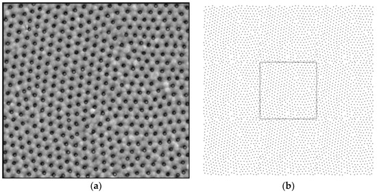 (a) Photograph of the sample of porous aluminum oxide layer from []. Circles around pore centers are plotted. (b) Array of pore centers obtained by a parallel translation of the pore centers in the initial array along the coordinate axes and the diagonals of the sample. The region containing pore centers in the starting sample is selected by a rectangle.