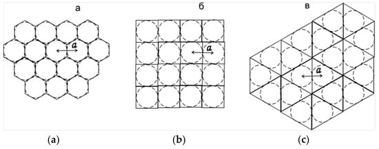 where represents a two-dimensional delta function by Dirac, and are position vectors of particles in an ideal lattice. The particles are situated in the nodes of the crystalline lattice. Summation in Equation (2) is performed over all the particles, except one, being in an origin of coordinates. As we have one particle per cell, an average density of the particles in an ideal crystal is easily calculated: where is an area of a crystal cell, is a lattice constant (i.e., diameter of a circle inscribed into the cell, as shown in Figure 2), and is the number of edges of a cell.