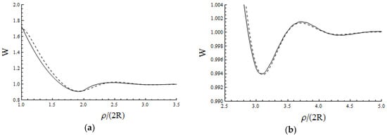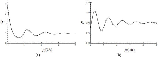 i.e., the radial distribution function is a superposition of two terms obtained by the spreading of square and hexagonal lattices with weight functions that depend on the distance. The functions and are calculated by Equation (8). The parameter determining spreading of the lattice depends on distance as ; that is, the nodes situated farther away are more strongly smeared. A comparison of the results with solutions of the Percus–Yevick equation is shown in Figure 4 and Figure 5. It should be noted that the Percus–Yevick equation is not analytically solved for hard disks on a plane, therefore numerical methods were used. It seems very interesting that the “tails” of the distribution function shown in Figure 4b and Figure 5b are modeled with high accuracy. The Percus–Yevick equation stops working when the filling parameter is greater than 0.63, which restricts the present analysis. However, it is evident that parameterization of the radial distribution function given by Equation (8) will be useful for higher disk concentrations, where phase transitions occur. Table 1 contains all the parameters used in the calculations. For simplicity, we assume that the parameters and determining smearing and some amount of defects/vacancies are the same for both lattices; however, the lattice constants are taken differently. As one can see, the spreading and number of defects decrease with increasing , i.e., the system tends to go from disorder to order. The interesting question is why the square lattice plays a major role in this range of packing fraction, and why the admixture of the triangle lattice shown in Figure 1c does not lead to a better coincidence.