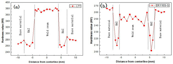 The peak microhardness of the weld zone of the LTT joint was 383 HV, significantly higher than that of the base metal (265~275 HV). The microhardness of the weld zone of the ER110S-G joint was 255 HV.