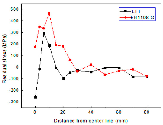 The residual tensile stress at the weld zone of the ER110S-G joint is 175.5 MPa, while the residual compressive stress at the weld zone of the LTT joint is −257.6 MPa. These results show that the low transformation temperature (LTT) wire can produce compressive stress, which is helpful in improving the joint performance.
