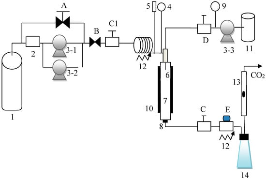CO2, which was used as the supercritical antisolvent, was supplied by Cheng-Feng Gas Co. (Taipei, Taiwan), with a minimum purity of 99.5%. The API sulfasalazine (CAS number: 599-79-1) was supplied by Sigma-Aldrich Co. (St. Louis, MO, USA), with a minimum purity of 98%. Tetrahydrofuran (THF), which was used as the solvent, was purchased from JT Baker (Center Valley, PA, USA), with a minimum purity of 99.5%. All chemicals were used without further purification. The experimental apparatus for SAS is described in detail in our previous study [,,]. As shown in Figure 1, the experimental apparatus depicted consisted of two high-performance liquid chromatography (HPLC) pumps (components 3-1 and 3-2) for delivering the supercritical CO2, and an HPLC pump (component 3-3) for delivering the sulfasalazine solution. The pressure and temperature of the experimental system were controlled using a back pressure regulator (valve A) and an electrical heating jacket (component 10), respectively. The pressure and temperature of the system were measured using a pressure transducer (component 4) and a thermocouple (component 5), with the resolutions of 0.1 K and 0.1 bar, respectively. The CO2 flowrate was controlled using a micrometering valve (valve E) and was measured using a rotameter under ambient conditions (component 13). Sulfasalazine crystallization occurred in a precipitator (component 7). The volume of the precipitator was 70 mL, and a stainless steel frit was installed at the bottom of the precipitator for sample collection. The SAS process was initiated with the injection of supercritical CO2 and the pure solvent (THF) into the precipitator until a steady state was achieved. Subsequently, the liquid feed flow was switched to the sulfasalazine solution for API crystallization. After API crystallization, supercritical drying was performed by delivering supercritical CO2 continuously to eliminate the residual solvent inside the precipitator. Subsequently, the precipitator was depressurized, and the samples on the stainless steel frit were collected for further analysis.