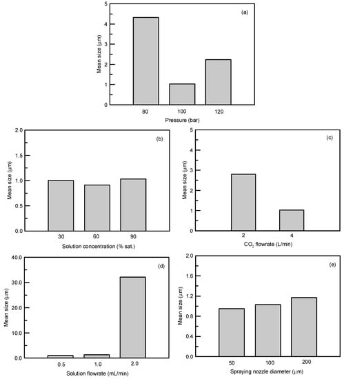 Effects of the (a) operating pressure, (b) solution concentration, (c) CO2 flowrate, (d) solution flowrate, and (e) spraying nozzle diameter on the mean particle size of SAS-processed sulfasalazine.