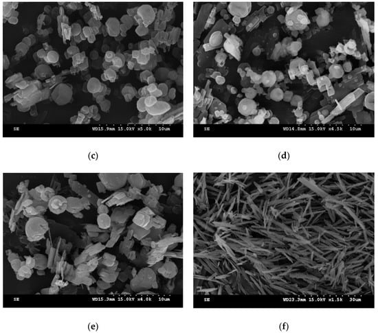 SEM images of sulfasalazine crystals: (a) Rod-like particles obtained from Exp. 10; (b) spherical particles obtained from Exp. 9; (c) spherical and irregular particles obtained from Exp. 11; (d) spherical and irregular particles obtained from Exp. 14; (e) spherical and irregular particles obtained from Exp. 15; and (f) needle-like particles obtained from Exp. 16.