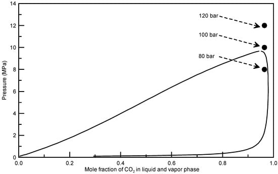 Predicted vapor-liquid equilibrium (VLE) locus for the binary mixture of CO2 and THF using the Predictive Soave-Redlich-Kwong (PSRK) equation of state at 55 °C (● operation point at three exerimental pressures).
