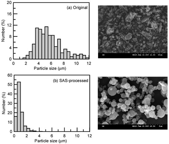 Particle size distribution and crystal habit of sulfasalazine crystals before and after the SAS process: (a) Original and (b) spherical particles obtained from Exp. 13.