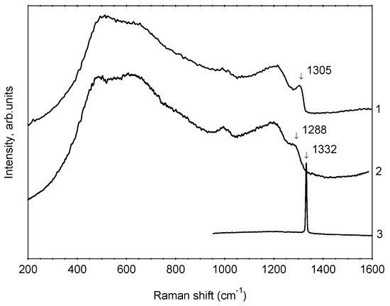 Raman spectra: 1—Sample N1; 2—Sample N2; 3—ordinary microdiamond.