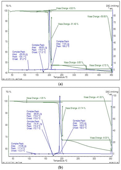 Thermogravimetry (TG) (green) and differential scanning calorimetry (DSC) (blue) curves of initial (a) and cryomodified (b) dioxidine forms.