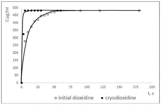 Dissolution curves of the initial and cryomodified dioxidine forms are presented in Figure 3. While the cryomodified dioxidine completely dissolves in water after 5 s, reaching maximal concentration of 470 mg/mL at 25 °C, it takes more than 50 s for the initial dioxidine form to be fully dissolved. A higher dissolution rate for the cryomodified dioxidine is possibly due to the smaller size of its particles and to the larger value of its specific surface area compared to the original dioxidine. Also, different dissolution rates of two dioxidine forms can be related to differences in their crystal structure.