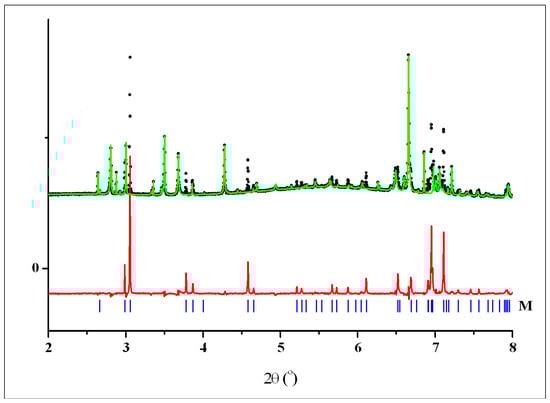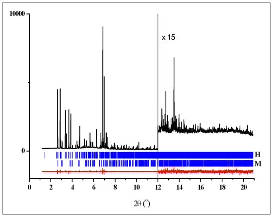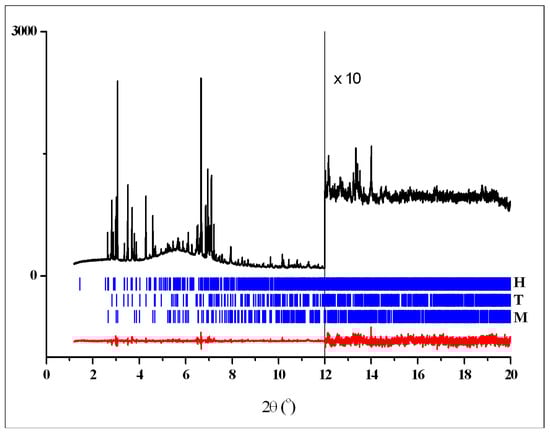 Crystal data, data collection, and refinement parameters for crystalline phases T, M and H are shown in Table 1. Rietveld plots after the final refinements for powder patterns 1–3 are shown in Figure 4, Figure 5 and Figure 6, respectively. Figure 7 shows powder pattern 2 and difference plot, calculated taking into account the contribution of two phases only—H and T, to demonstrate significant diffraction peaks from the third phase M.