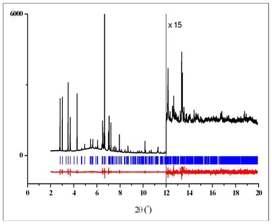 Rietveld plot for the single-phase pattern of 3 showing the experimental (black) and difference (red) curves. The vertical blue bars denote the calculated positions of diffraction peaks for crystalline phase T.