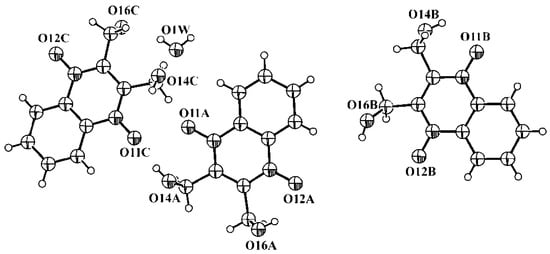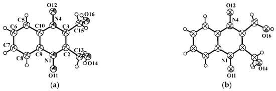 The molecule of 2,3-bis(Hydroxymethyl)-quinoxaline-1,4-di-N-oxide (dioxidine) possesses only two internal degrees of freedom, so its conformations in various crystalline phases may differ in torsion angles N–C–C–O(H) only. In anhydrous polymorphs T and M, the asymmetric unit contains only one independent molecule, and conformations of these molecules are different (Figure 8, prepared with PLATON []). The asymmetric unit of the hydrated crystalline phase H contains three independent dioxidine molecules with different conformations and one water molecule (Figure 9).