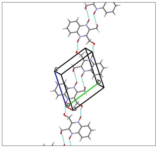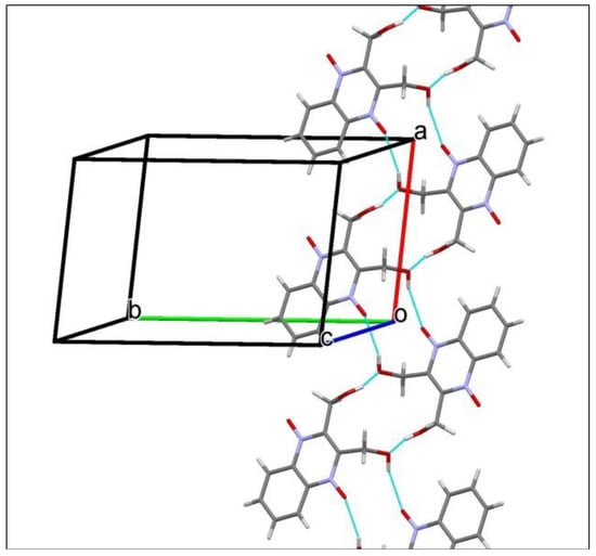 The dioxidine molecule has two hydroxy-groups, which can serve both as donors and acceptors in hydrogen-bonding, and four oxygen atoms can be considered as acceptors. Thus, one can expect various hydrogen-bonding networks, which can consolidate the crystal packing of the dioxidine molecules. In T, classical intermolecular O–H···O hydrogen bonds (Table 2) link the molecules into chains extended in [1-1-1] (Figure 10, prepared with Mercury []), and weak intermolecular C–H···O interactions (Table 2) held these chains together in the crystal.
