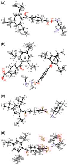 The Ortep view [] for compounds (a) (1) at 1.3 GPa; (b) (2) at 1.0 GPa; (c) (3) at 0.1 MPa; and (d) (4) at 0.1 MPa. The displacement parameters of non-hydrogen atoms were drawn at a 30% probability level. The atoms of the minor component of (4) were connected by empty bonds.