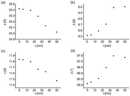 The variations in (a) a; (b) b; (c) c; and (d) β for compound (1) at 0.1 MPa along with the time of UV irradiation. For a better comparison, the range of the y axis was set the same for plots (a)–(c).