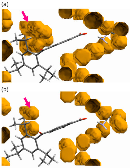 The free space for compound (1) at (a) 0.1 MPa and (b) 1.3 GPa. The arrow indicates the void suitable for the Norrish–Yang reaction with 2-isopropyl. The radius of a ball was 0.9 Å and the grid was 0.2 Å [].