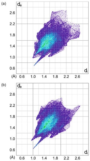 The fingerprints for anions (a) A and (b) B of compound (2) at 1.0 GPa [,].