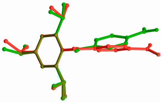 The A (red) and B (green) anions of compound (2) at 1.0 GPa superimposed in the C1→C6 plane.