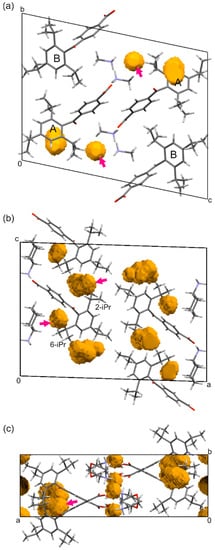 The free space in the crystals of compounds (a) (2) at 1.0 GPa; (b) (3) at 0.1 MPa; and (c) (4) at 0.1 MPa. The arrows show the voids in close proximity to o-isopropyl groups. The radius of a ball was 1.0 Å and the grid was 0.2 Å [].