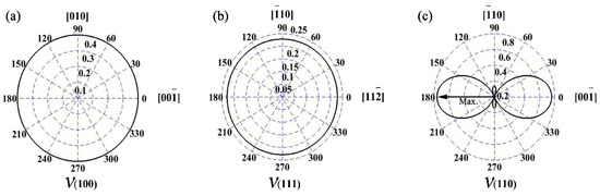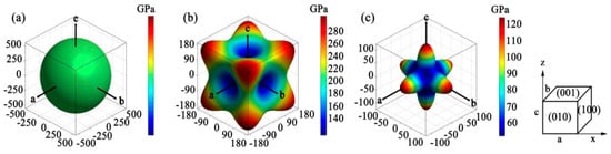 The corresponding calculation results are listed in Table 5. The maximum and minimum values of Young’s moduli are 304.241 GPa and 112.094 GPa along the normal direction of {111} and {100} planes, respectively, which are consistent with the results shown in Figure 2b.