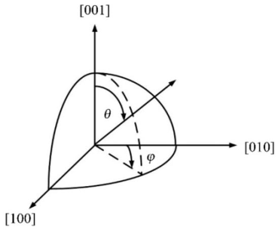 wherein θ and ϕ are Euler angles, as shown in Figure 3. Figure 2c shows the shear moduli of Ni3Al along different orientations. Clearly, shear modulus anisotropy can be deduced, with the maximum and minimum values are 123.831 GPa along <001> directions and 51.696 GPa along <111> directions, respectively. Generally, the direction dependence of shear modulus is opposite to that of Young’s modulus.