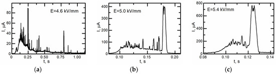 Typical switching current shapes measured during the polarization reversal without artificial dielectric layer. Field: (a) 4.6 kV/mm; (b) 5.0 kV/mm; and (c) 5.4 kV/mm.