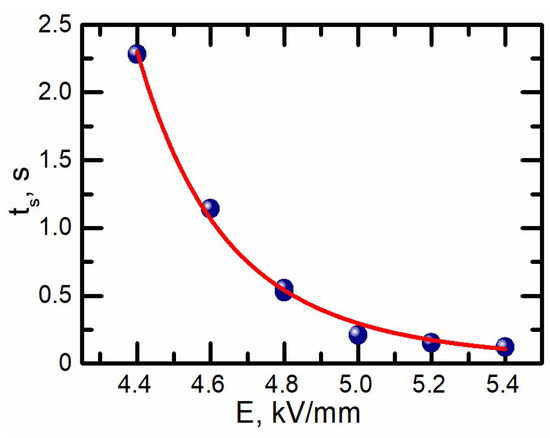 The activation-type field dependence of the switching time was obtained by analysis of the switching current data for various fields (Figure 10). The fitting of experimental data by Equation (1) allowed extracting the activation field equal to (41 ± 2) kV/mm and bias field equal to (1.5 ± 0.2) kV/mm.