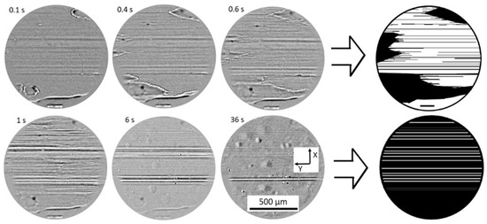 The instantaneous images of domain structure during polarization reversal with artificial dielectric layer. Optical microscopy, transmitted light. External field 5.2 kV/mm. The black-and-white images on the right side are the sketches of domain structure at 0.6 s and 36 s, correspondingly. The switched domains are indicated by black color.