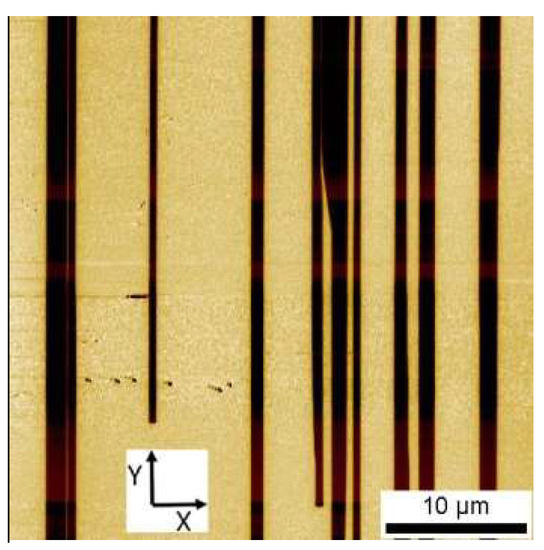 The visualization of the domain structure after partial polarization reversal by piezoresponse force microscopy (PFM) has shown that the streamer width ranged from 0.5 to 2 μm (Figure 6).