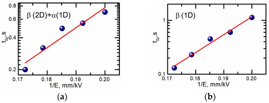 The characteristic times of the β(2D) + α(1D) and β(1D) processes obtained from the fitting of the switching current data followed the activation type field dependences (Figure 9).